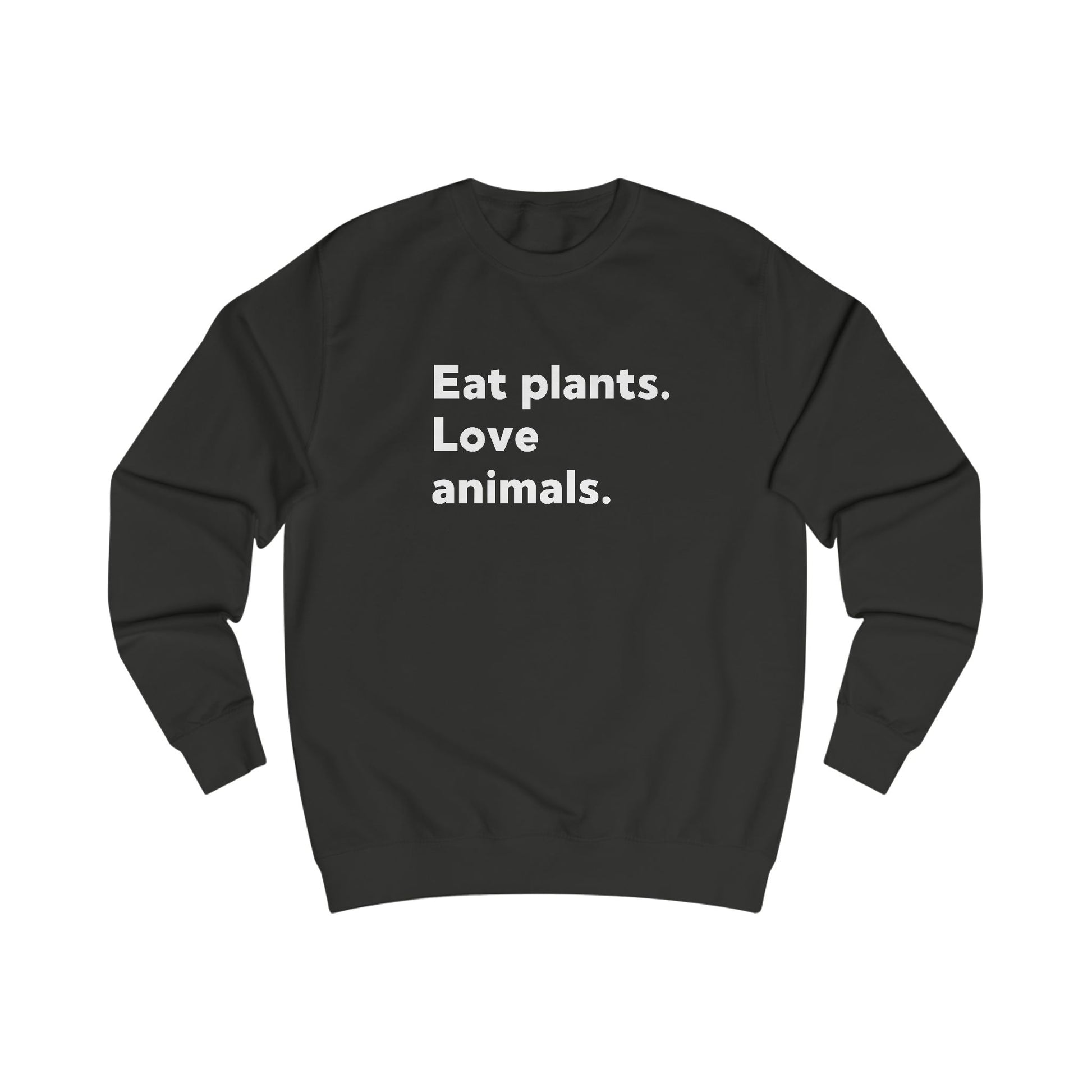 Show your commitment to plant-based living and animal rights with this "Eat Plants. Love Animals." black sweatshirt. Perfect for vegans, vegetarians, and anyone who supports ethical eating, this sweatshirt makes a bold statement while keeping you comfortable.