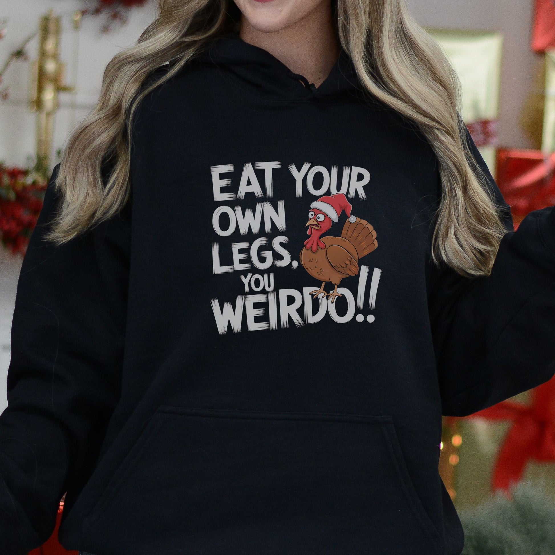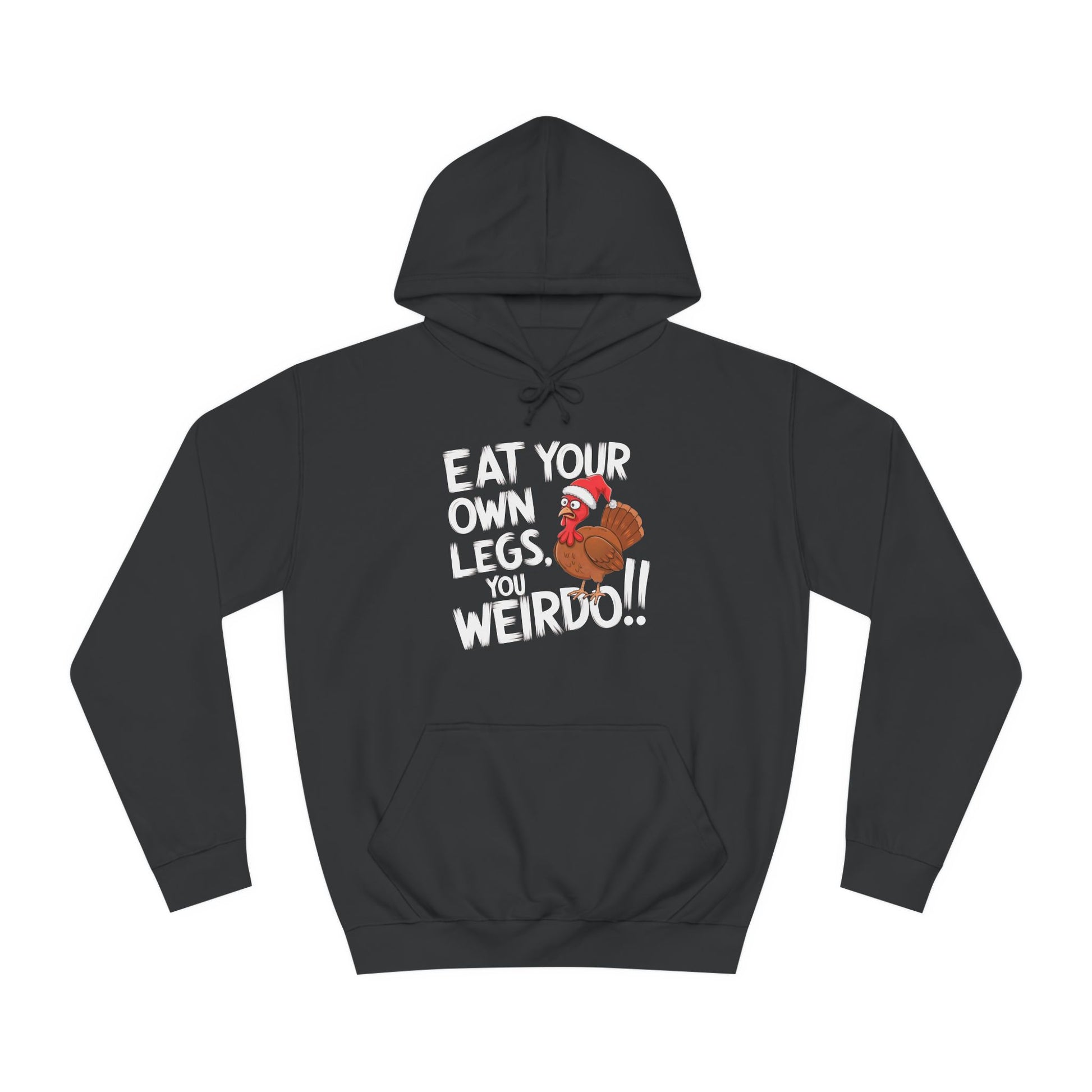 Stay cosy this Christmas with a hoodie that’s as bold as it is festive! Featuring the slogan "Eat Your Own Legs, You Weirdo!!" and a hilarious illustration of a shocked turkey in a Christmas hat, this hoodie is perfect for vegans, vegetarians, or anyone with a cheeky sense of humour.